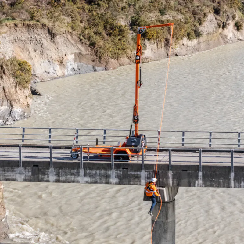 The AirHook Trailer is a complete overhead fall protection system and is mounted on a tow-able road registered trailer suitable for all road conditions. The AirHook Trailer provides fall protection for up to two workers on an overhead anchor point that is easy to set-up. The main mast of the AirHook Trailer is raised or lowered using and electric (DC) / hydraulic pump and valve arrangement.